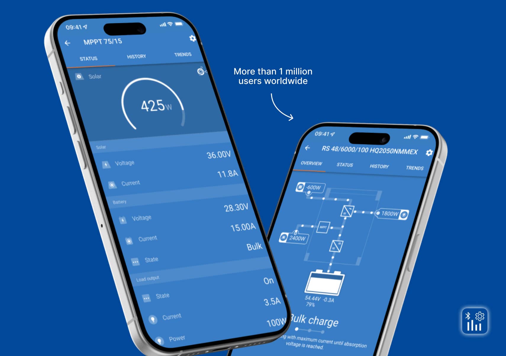 VictronConnect le permite obtener información de estado en tiempo real y configurar cualquier producto de Victron que tenga Bluetooth integrado o que esté conectado a una mochila VE.Direct Bluetooth Smart.